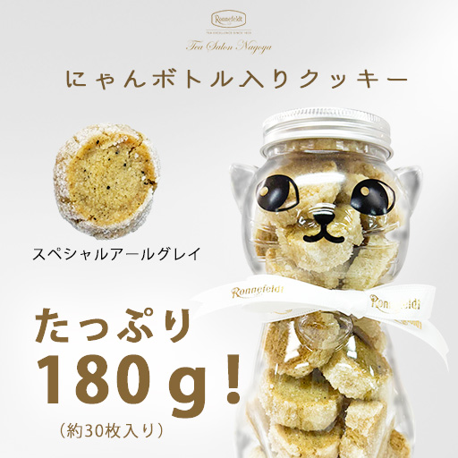 サロン自慢のアールグレイクッキーをたっぷり180g、可愛いにゃんボトルに入れてお届けいたします。