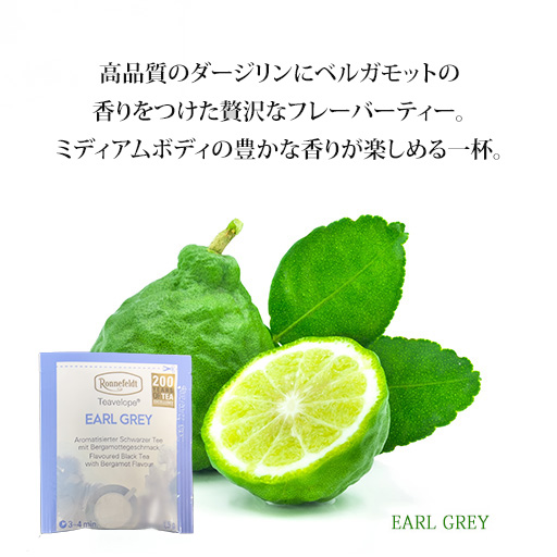 ダージリン茶葉にベルガモットの香りをブレンドした上品な香りと味わい。一般的なアールグレイはインド茶と中国茶のブレンドが多いですが、ロンネフェルトはダージリンのみを使用。品質にこだわった逸品です。