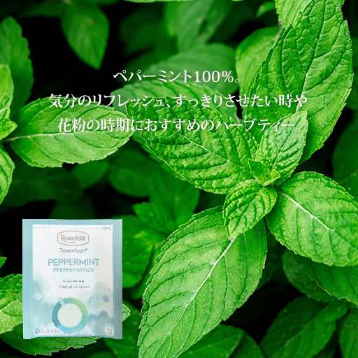 爽やかなペパーミントの葉100%使用。気分をリフレッシュしたい時にぴったりです。ノド・鼻がスーッとするので花粉症や鼻炎の方にもおすすめ。ハーブが苦手な方や男性にも喜ばれる商品です。