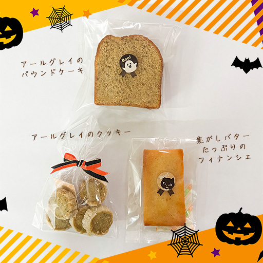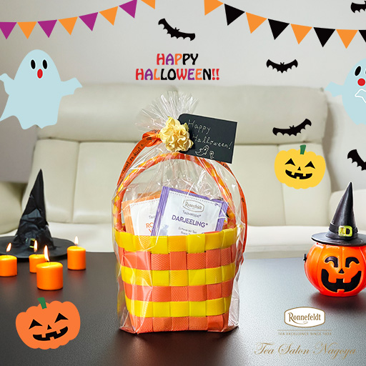 可愛いミニサイズのプラカゴに、人気のティーベロップシリーズ2枚とハロウィンにぴったりなお菓子を詰めました。
