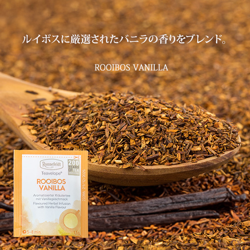 やさしい甘い香りとやわらかい味わい。クセのないルイボスの茶葉に厳選されたバニラのアロマをブレンド。