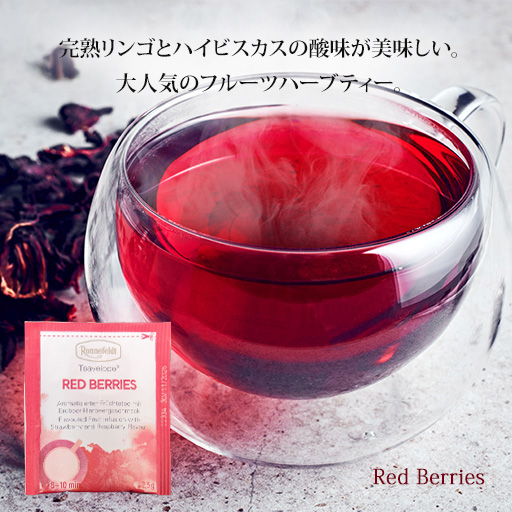 完熟したリンゴとベリー類をブレンド。真っ赤な水色のフルーツハーブティー。甘酸っぱい香りが口の中に広がります。