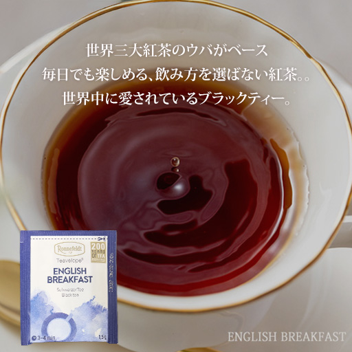 朝・昼・夜、どんなシーンにも合う爽やかなメチルサルチレートの香りが特徴。世界三大紅茶のウバがベースで、ストレート・ミルク・レモン、いずれでも美味しくいただけます。カフェインが多く、すっきりしたい時や眠気覚ましにおすすめ。