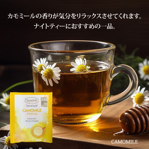 カモミールはリンゴの芳香に例えられる、ハーブの代表格。リラックス効果があるのでおやすみ前におすすめ。ハチミツとの相性抜群です。