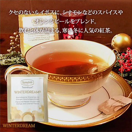 クセのないルイボスにスパイス・シナモン・オレンジピールをブレンド。フルーティーでスパイシーなルイボスティー。ヨーロッパでは通年人気の商品です。